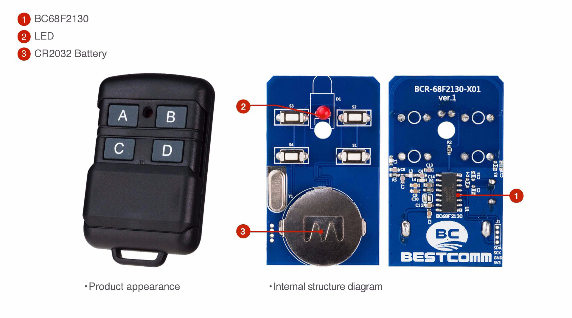 The BCR-68F2130-X01 is a 4-button RF remote control of frequency 433.92MHz with a built-in Holtek 8-bit MCU BC68F2130. When users press any button, the remote control starts sending signals and lights up LED. It is suitable for applications of garage door remote control, electric curtain remote control, etc.