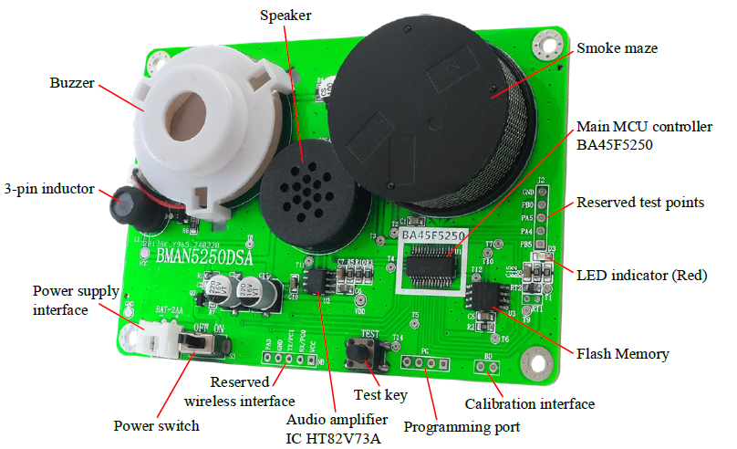 BMAN5250DSA is a development board based on the Holtek 8-bit smoke detector MCU BA45F5250.