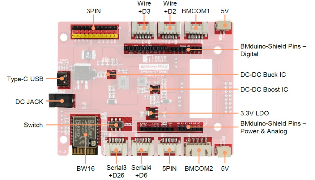 The BMB81TB01A is an IoT expansion board developed by BestModules for the BMduino series, designed specifically for the BMduino UNO development board (BM53A367A) . Simply stack this expansion board on top of the main board and it immediately converts the scattered I/O pins into easy-to-use HY2.0 keyed connectors, greatly simplifying wiring and setup.