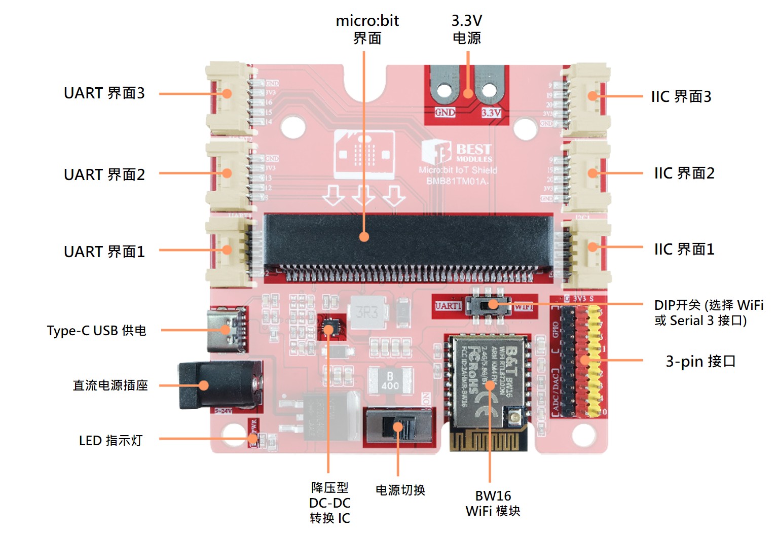 扩展板板载 Wi-Fi + BLE 5.0 无线模块,并提供多组 3PIN 与 I2C、UART 接口,可快速适配倍创 BMduino 系列模块产品。无论是物联网主题课程、传感器整合实验,还是互动装置与专案实作,BMB81TM01A 都能让 micro:bit 的应用开发变得更直观、更顺畅。